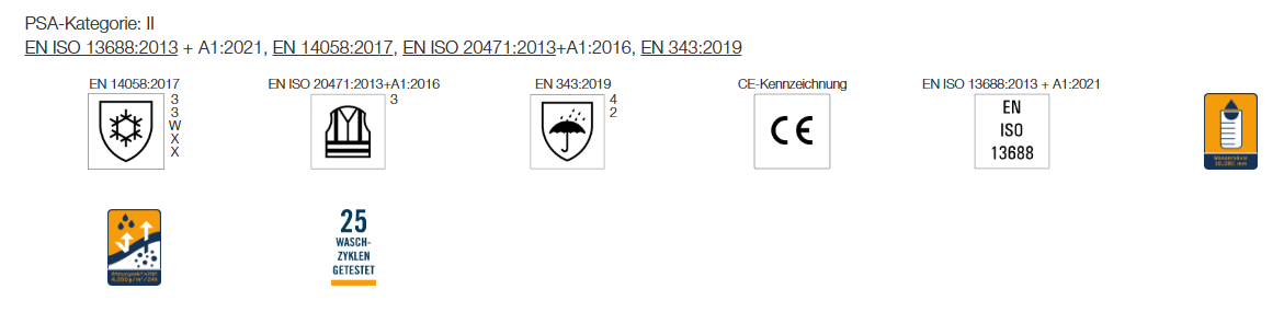 - Segmentierte, auflaminierte Reflexstreifen, umlaufend um Körper und Ärmel sowie über die Schulterpartien (Hosenträgerreflexstreifen)