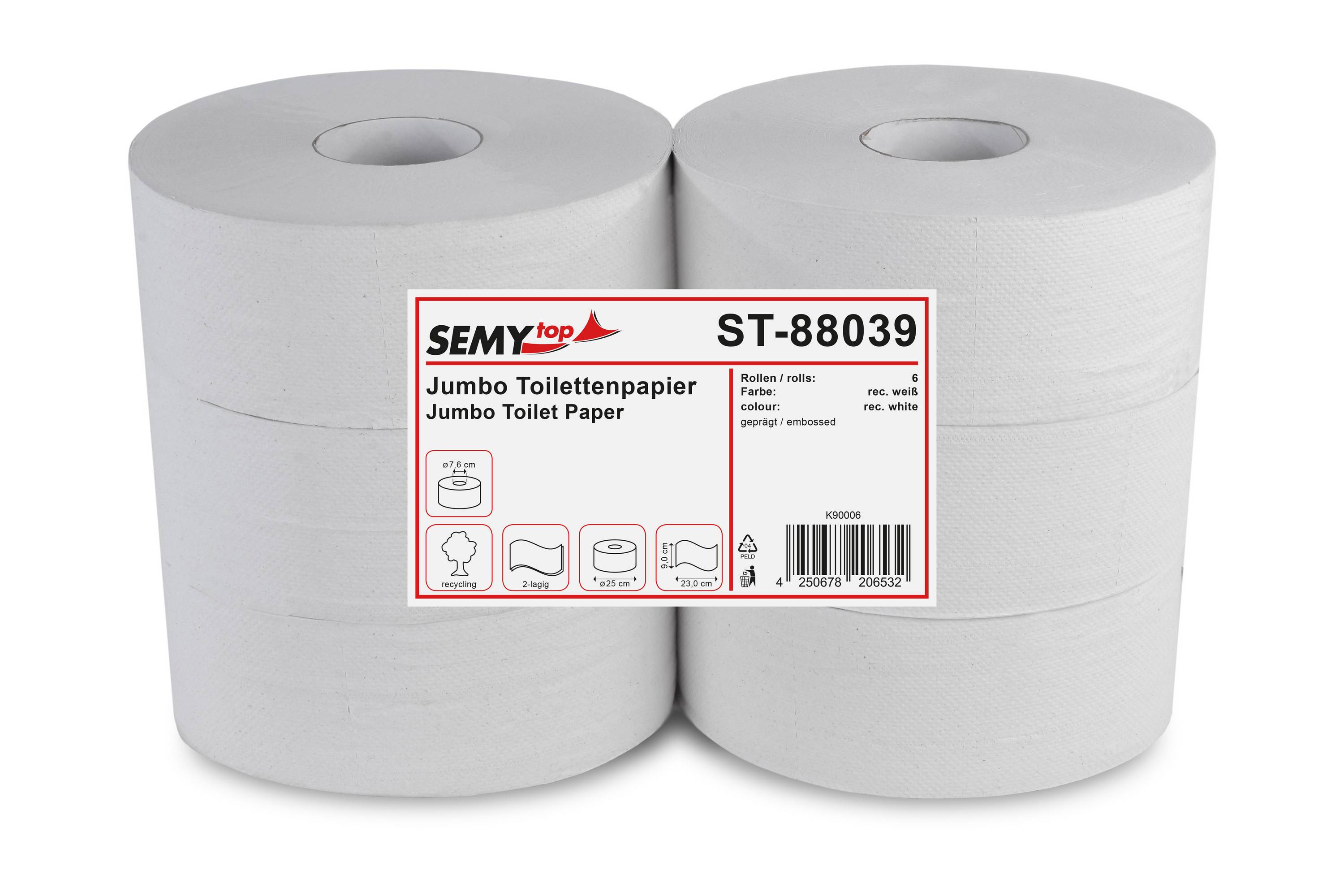 Die 2-lagigen, microgeprägten Rollen SemyTop 88039 mit einem Durchmesser von 25 cm sind speziell für mittelstark frequentierte Sanitärbereiche konzipiert und passen in alle gängigen Jumbo-Toilettenpapierspender. Jede Packung enthält sechs hochwertige Rollen, die durch ihre robuste Verarbeitung und exzellente Saugkraft überzeugen.