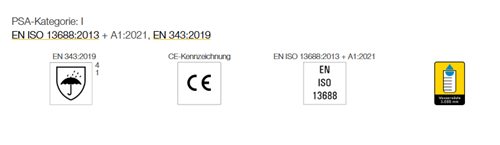 - EN ISO 13688:2013 + A1:2021, EN 343:2019
